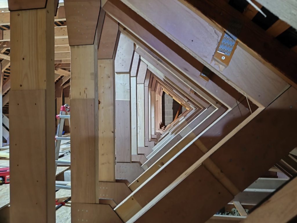 Le principe est relativement simple sur le papier et garantit un résultat de qualité, avec des assemblages de type industriel. Toutefois, compte tenu des dimensions de la toiture et des sections de bois particulièrement importantes, l’exécution a nécessité une organisation rigoureuse.