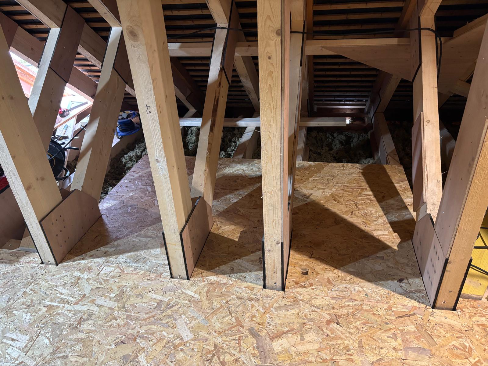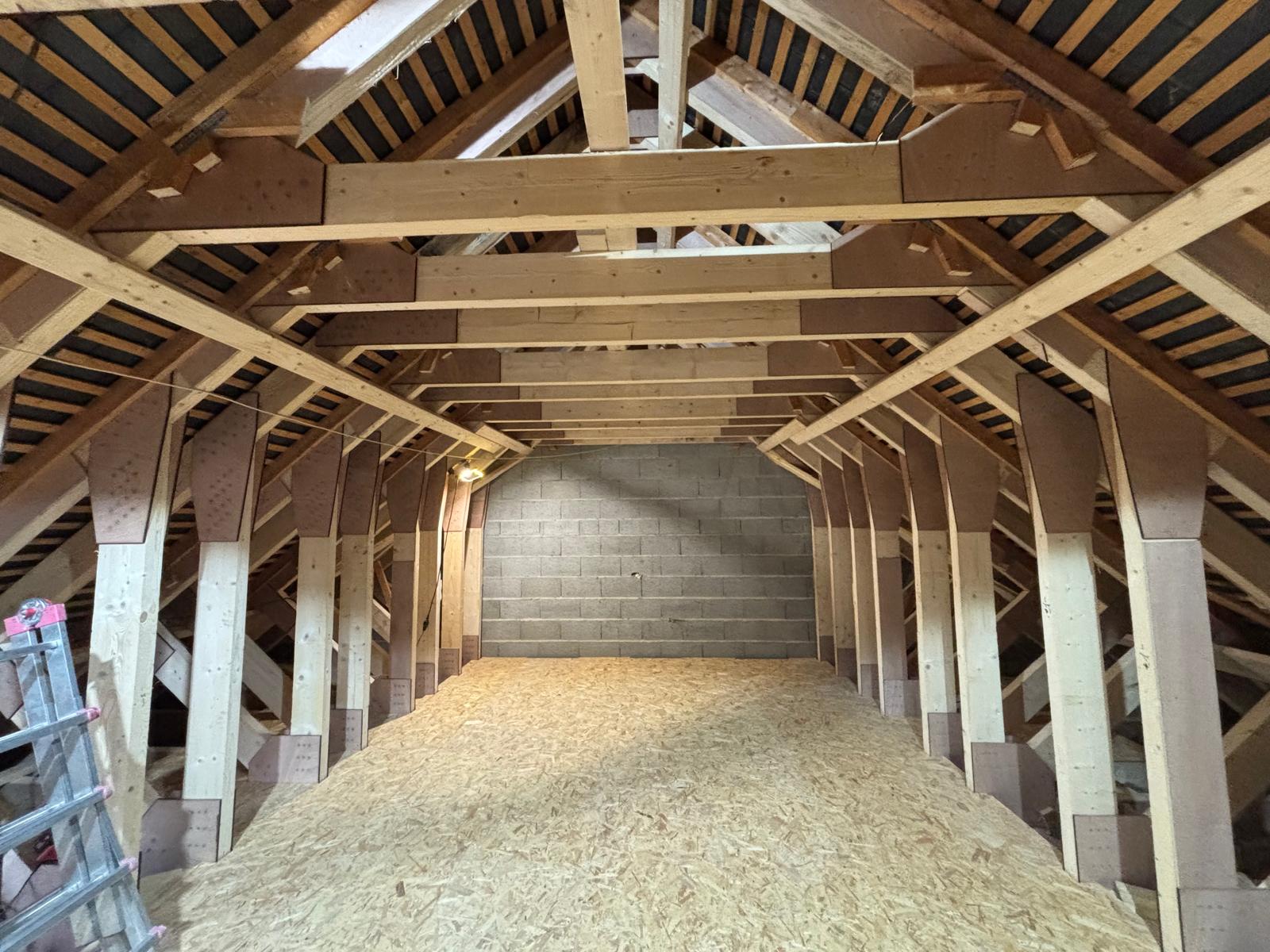 La mise en place des fermes s’est révélée technique : chaque intervention devait être soigneusement planifiée afin de ne pas fragiliser l’ancienne structure au fur et à mesure des découpes, ni provoquer de déformation du bâti. Parallèlement, le plancher a été renforcé pour supporter les futures charges d’habitation.